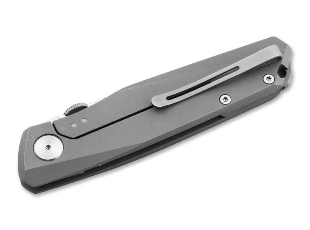 De handgreepschalen van hoogwaardig titanium met een discrete parelstraalafwerking liggen comfortabel in de hand, terwijl jimpings op de rug van het mes de werkveiligheid verhogen. Geleverd met een decoratieve mesasschroef, een koordgat, een praktische deep-carry clip (tip-up/r) en een hoogwaardig nylon etui.